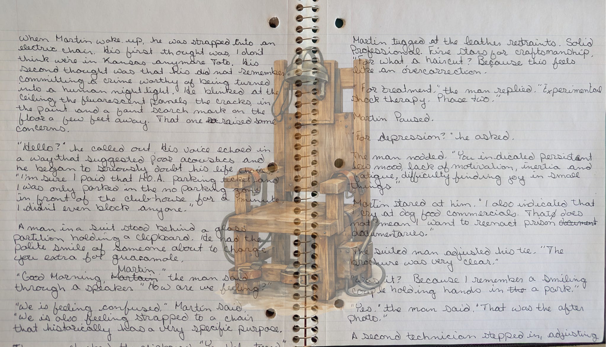 When Martin woke up, he was strapped into an electric chair. His first thought was, I don’t think we’re in Kansas anymore Toto. His second thought was that he did not remember committing a crime worthy of being turned into a human nightlight. He blinked at the ceiling, the fluorescent panels, the cracks in the paint and a faint scorch mark on the floor a few feet away. That one raised some concerns.